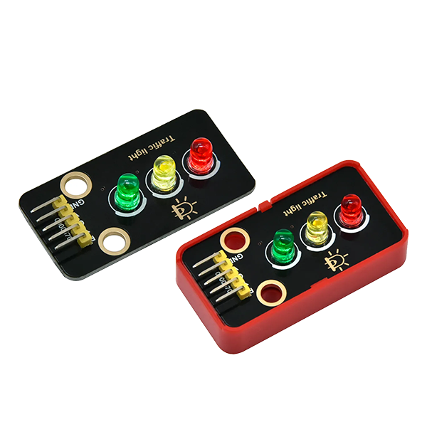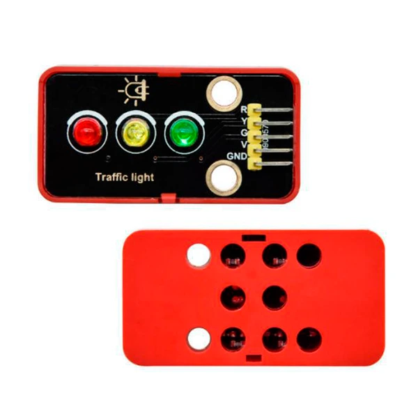 Dispositivo que integra tres LED (rojo, amarillo y verde) en disposición tipo semáforo, sobre un case apto para acoplar a fichas tipo bloques de construción. Cada color se controla desde una salida digital independiente y se utiliza para simulación de tráfico, proyectos de ciudad inteligente, lógica secuencial y enseñanza de sistemas de control.