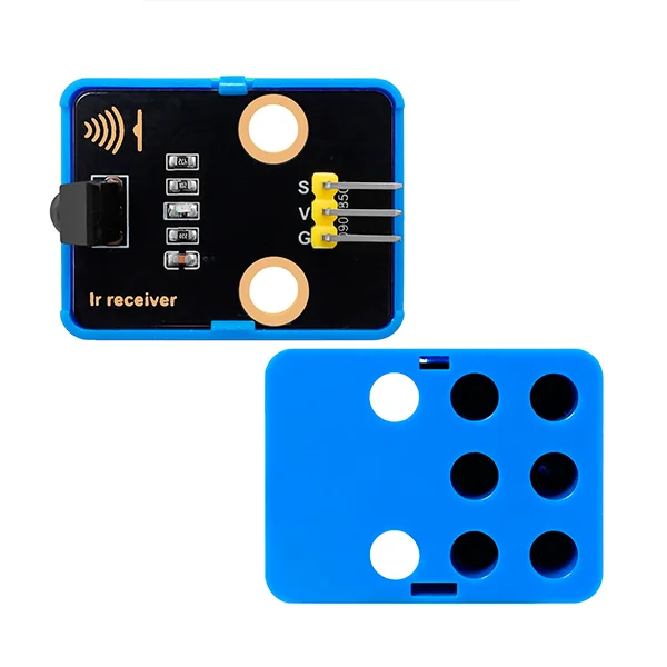 Dispositivo que integra un receptor IR demodulado en un case apto para fichas tipo bloques de construcción, listo para leer señales de mandos a distancia. Proporciona una salida digital con los pulsos recibidos y se utiliza para controlar proyectos mediante controles IR, crear sistemas de media center DIY y prototipos de domótica.