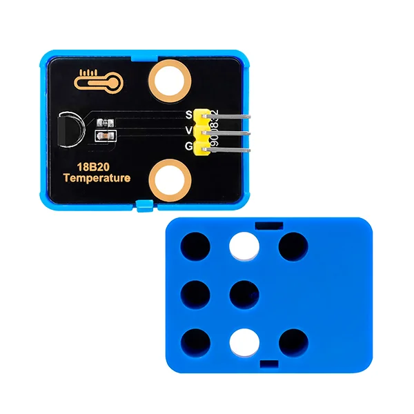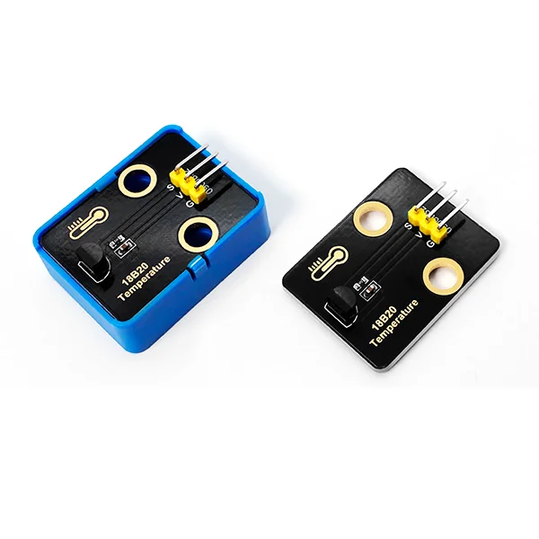 Dispositivo que integra el sensor digital DS18B20 sobre un case que puede fijarse a fichas tipo bloques de construcción, con interfaz 1-Wire. Permite lecturas de temperatura precisas con una sola línea de datos y se utiliza para medir temperatura en fluidos, exteriores, puntos remotos y sistemas que requieran cableado sencillo y fiable.
