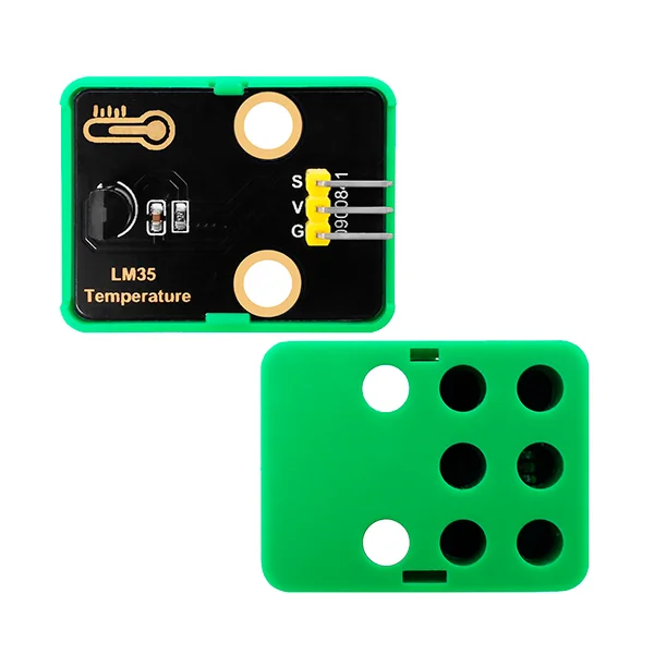 Dispositivo que monta el sensor analógico LM35 en un case compatible con fichas tipo bloques de construcción. Entrega una tensión analógica proporcional a la temperatura en °C y se utiliza para monitoreo térmico de componentes, medición ambiental, activación de ventiladores y prácticas educativas sobre sensores analógicos.