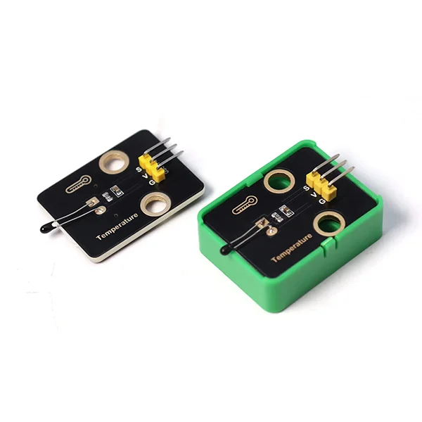 Dispositivo que emplea un termistor NTC MF52AT montado en un case compatible con fichas tipo bloques de construcción, funcionando como sensor resistivo. Se lee mediante una entrada analógica y se utiliza para medir temperatura ambiente, monitorear calentamiento de componentes, controlar ventiladores o realizar prácticas de termometría en laboratorio.