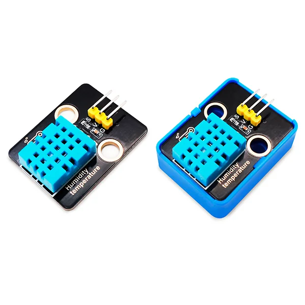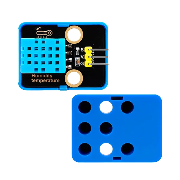 Dispositivo que combina un sensor digital de temperatura y humedad DHT11 en un case compatible con fichas tipo bloques de construcción. Se comunica mediante un protocolo serie de una sola línea y se utiliza para estaciones meteorológicas, control de invernaderos, monitoreo de aulas/laboratorios y proyectos IoT básicos de clima y confort.
