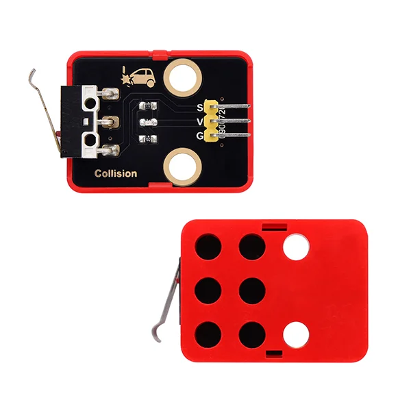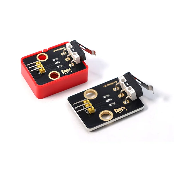 Dispositivo que combina un microinterruptor mecánico con un case compatible con fichas tipo bloques de construcción para detectar impacto directo. Cambia su estado digital cuando el robot o mecanismo golpea un obstáculo y se utiliza para sistemas de parada por choque, cambio de dirección y detección de límites físicos en plataformas móviles.