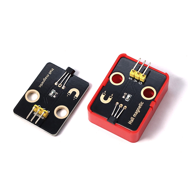 Dispositivo que contiene un sensor Hall de efecto magnético montado sobre un case compatible con fichas tipo bloques de construcción. Entrega una salida digital o conmutada en presencia de un campo magnético y se utiliza para medir velocidad de giro con imanes en ruedas, conteo de revoluciones, detección de posición y sensado sin contacto en mecanismos.