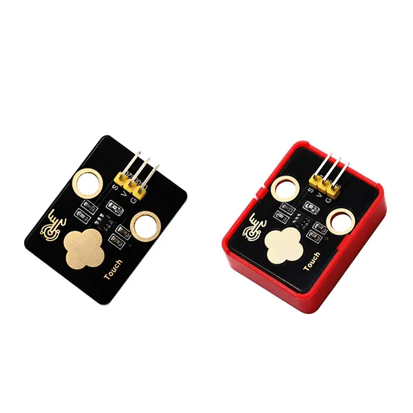 Dispositivo que implementa un sensor capacitivo de toque montado sobre un case compatible con fichas tipo bloques de construcción, sin partes mecánicas. Entrega una salida digital al detectar el contacto del dedo y se utiliza como sustituto de botones, para crear interfaces táctiles, paneles lisos y superficies interactivas en proyectos modernos.
