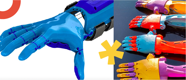 La comunidad internacional e-NABLE creó una red global de voluntarios que diseñan y fabrican prótesis impresas en 3D de bajo costo. Este proyecto comenzó cuando un inventor publicó el diseño de una mano mecánica.